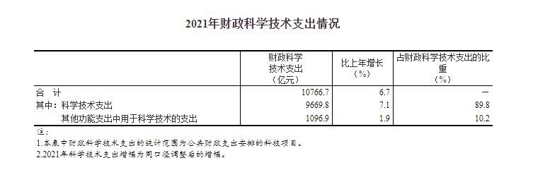 2021年,国家财政科学技术支出10766.7亿元,比上年增加671.7亿元,增长6.7%。其中,中央财政科学技术支出3794.9亿元,占全国财政科学技术支出的比重为35.2%;地方财政科学技术支出6971.8亿元,占比为64.8%。